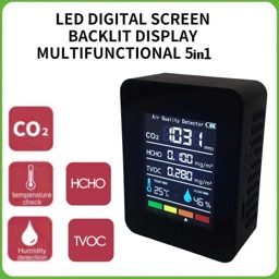 - Rentang Pengukuran: CO2: 400-5000 ppm, HCHO: 0-9999 mg/m³, TVOC: 0-9999 mg/m³, Temperatur: 1-70°C, Kelembapan: 0-99% RH