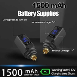 - Dimensi: Mesin Tato: Diameter 3 cm, Panjang 10.5 cm, Baterai: Diameter 3 cm, Panjang 7 cm