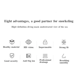 - Dimensi: Bodi Kacamata: 17 x 3.5 x 8.8 cm, Lensa: 15 x 7.5 cm, Selang Snorkel: 46.3 cm