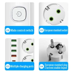 - Jumlah Soket: 6 x Soket AC, 4 x USB A, 1 x USB Type