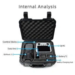- Kompartemen: 1 x Slot Drone DJI Mavic 3, 1 x Slot Remot Kontrol RC / RC-N1 / Pro (Liner EVA Dapat Dilepas), 1 x Slot Charger, 4 x Slot Stick Controller, 2 x Slot Baterai, 1 x Slot Kabel, 1 x Slot Hub Charger